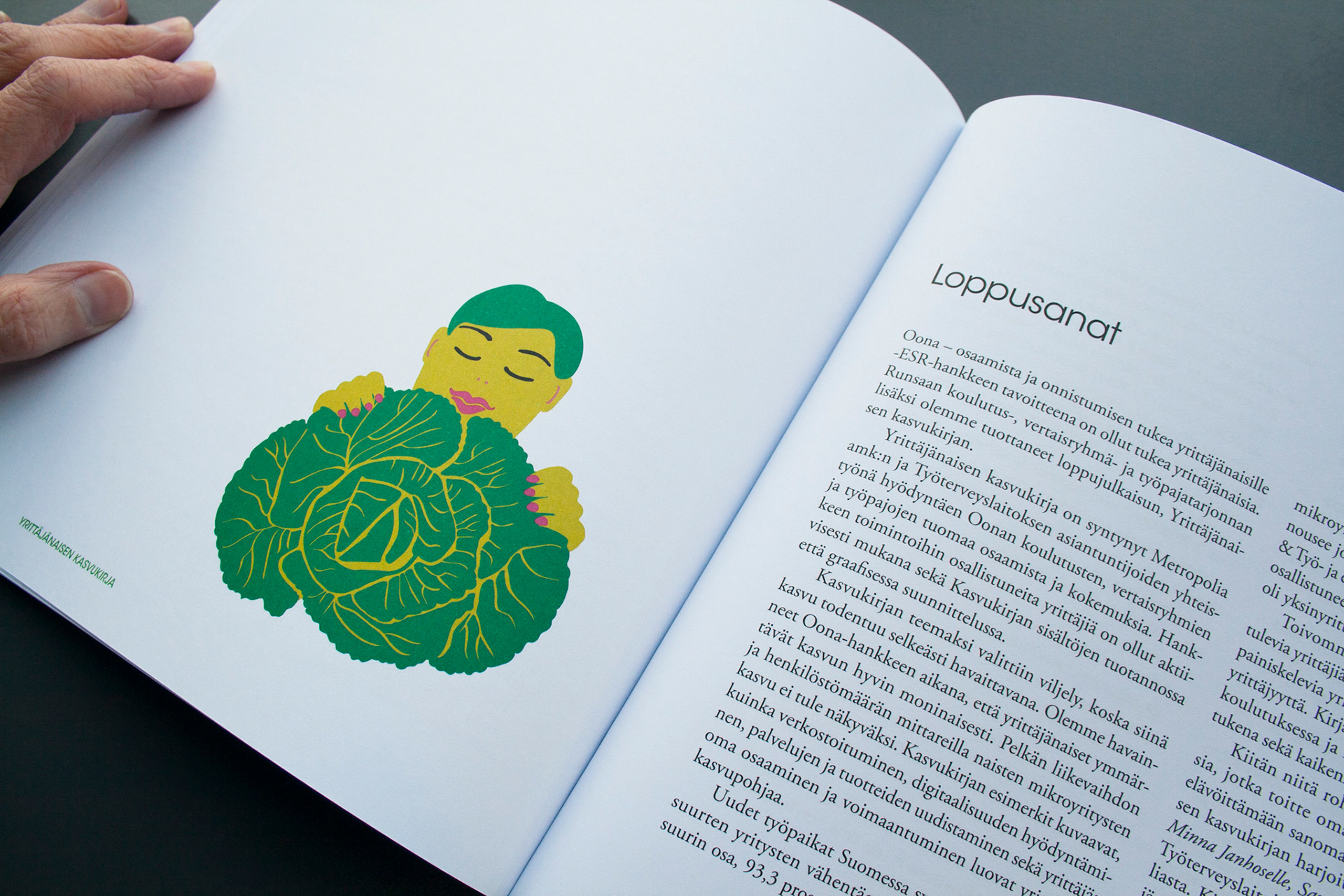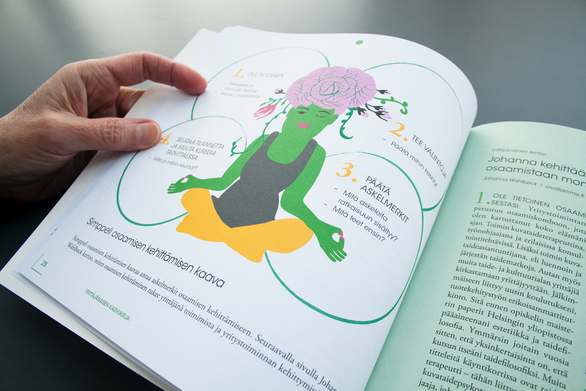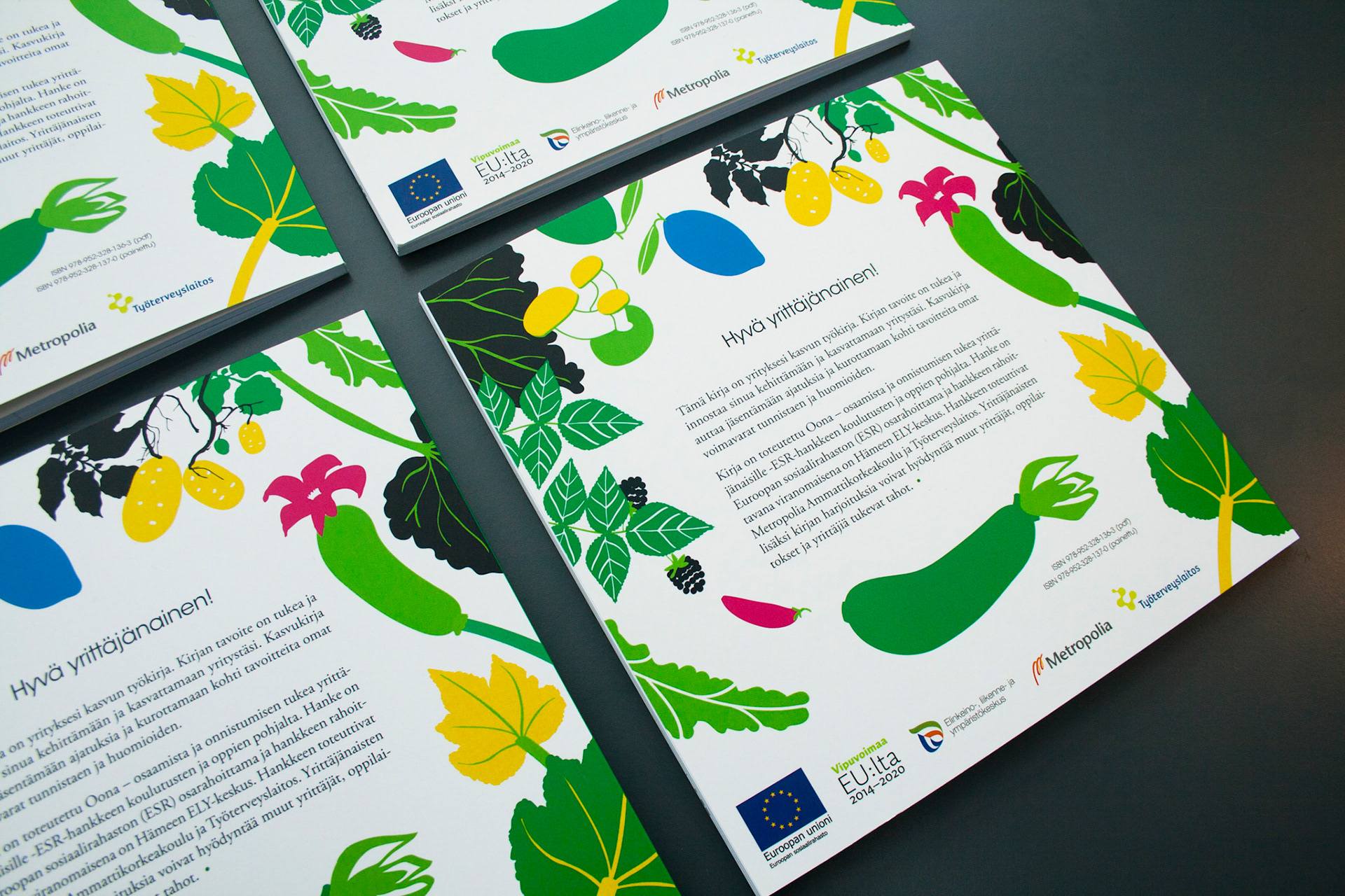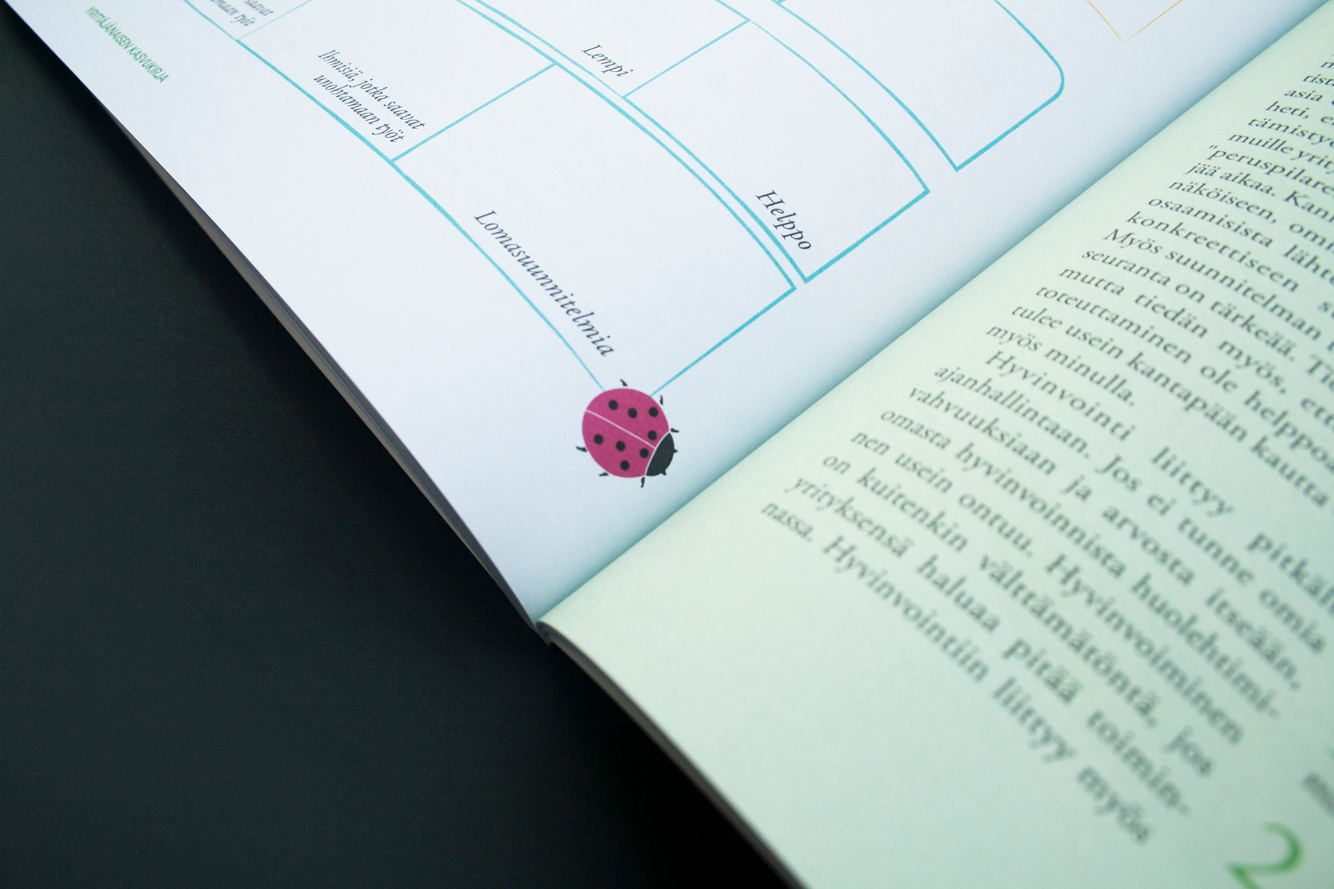 Toteutus: Uniikki visuaalinen ilme, taitto ja kuvitus, yrittäjänaisten opas- ja tehtäväkirjaan. Sisällöntuotanto: Metropolia Ammattikorkeakoulu ja Työterveyslaitos. Tilaaja: Oona – osaamista ja onnistumisen tukea yrittäjänaisille -ESR-hanke.