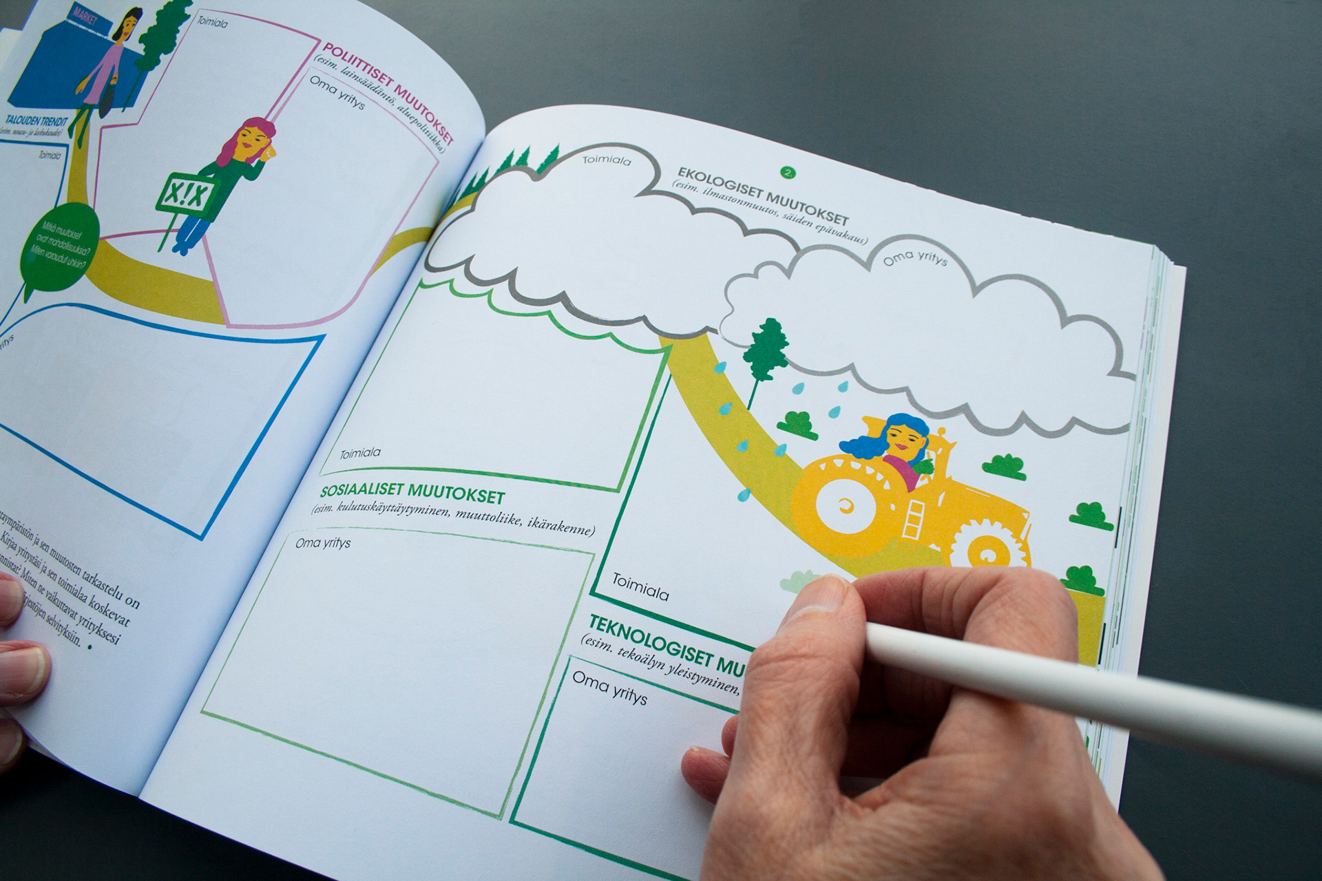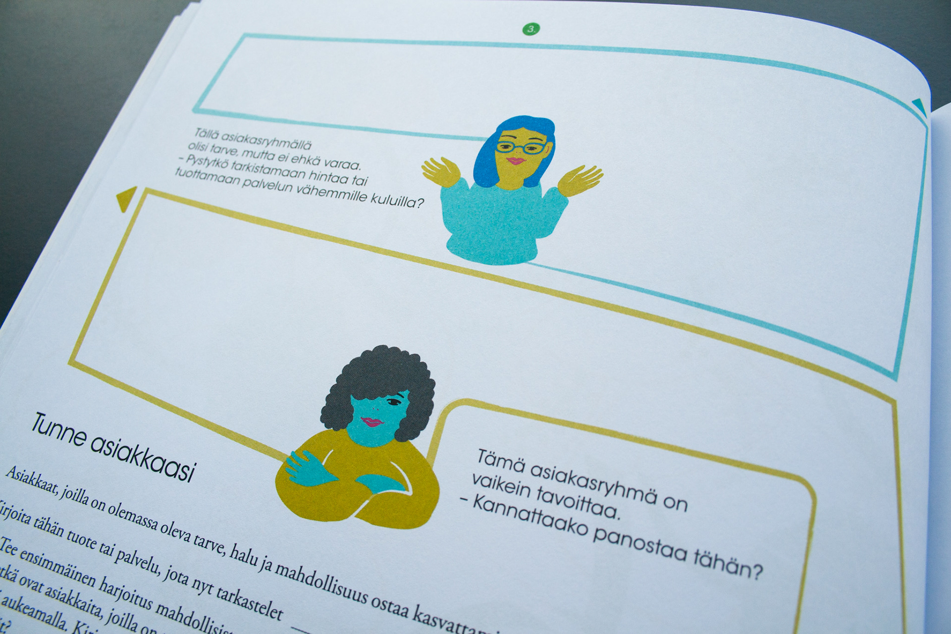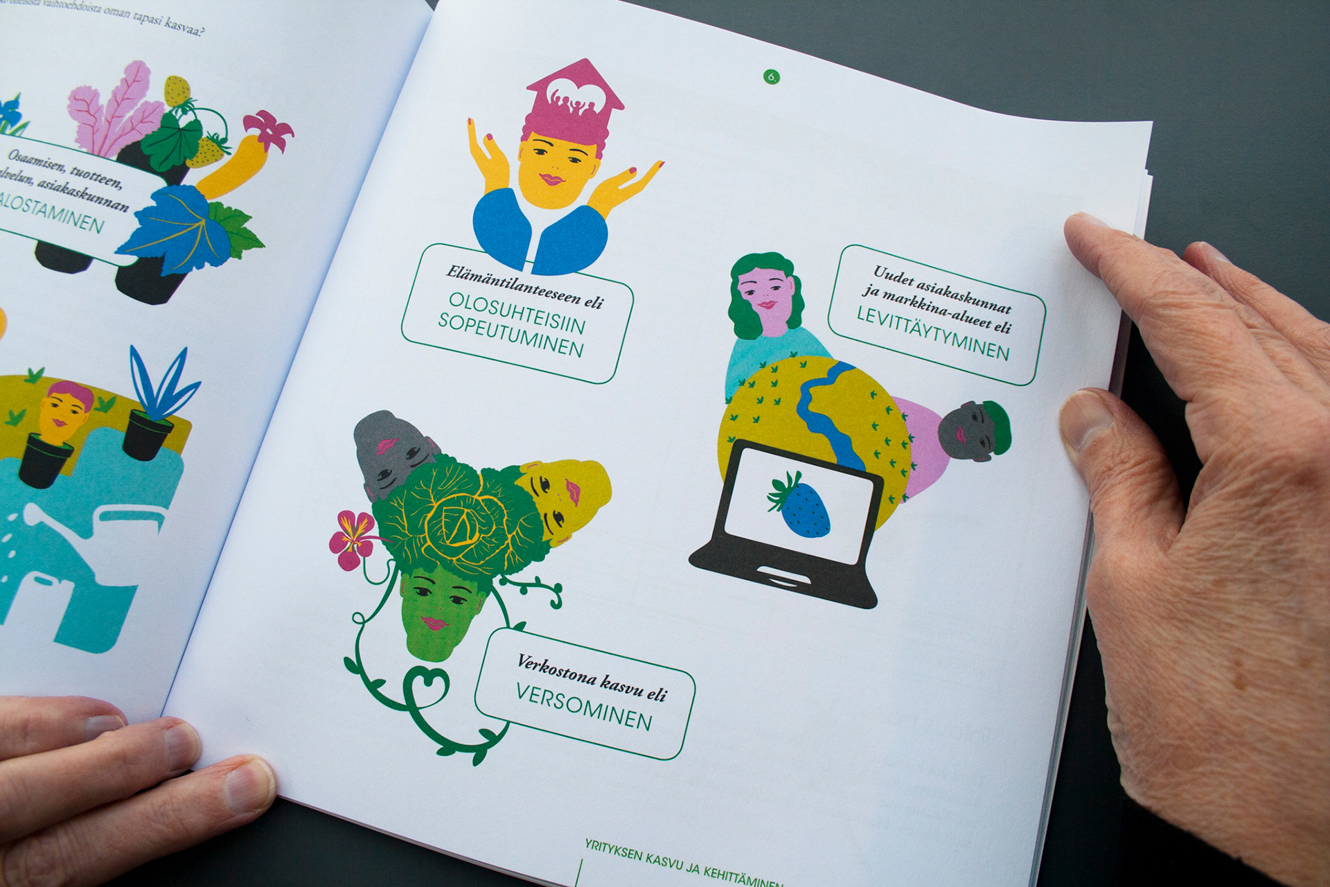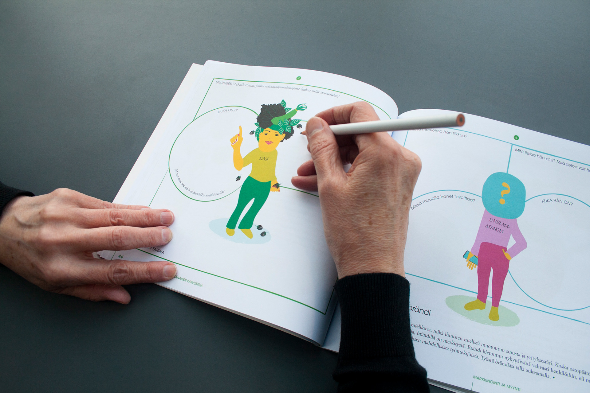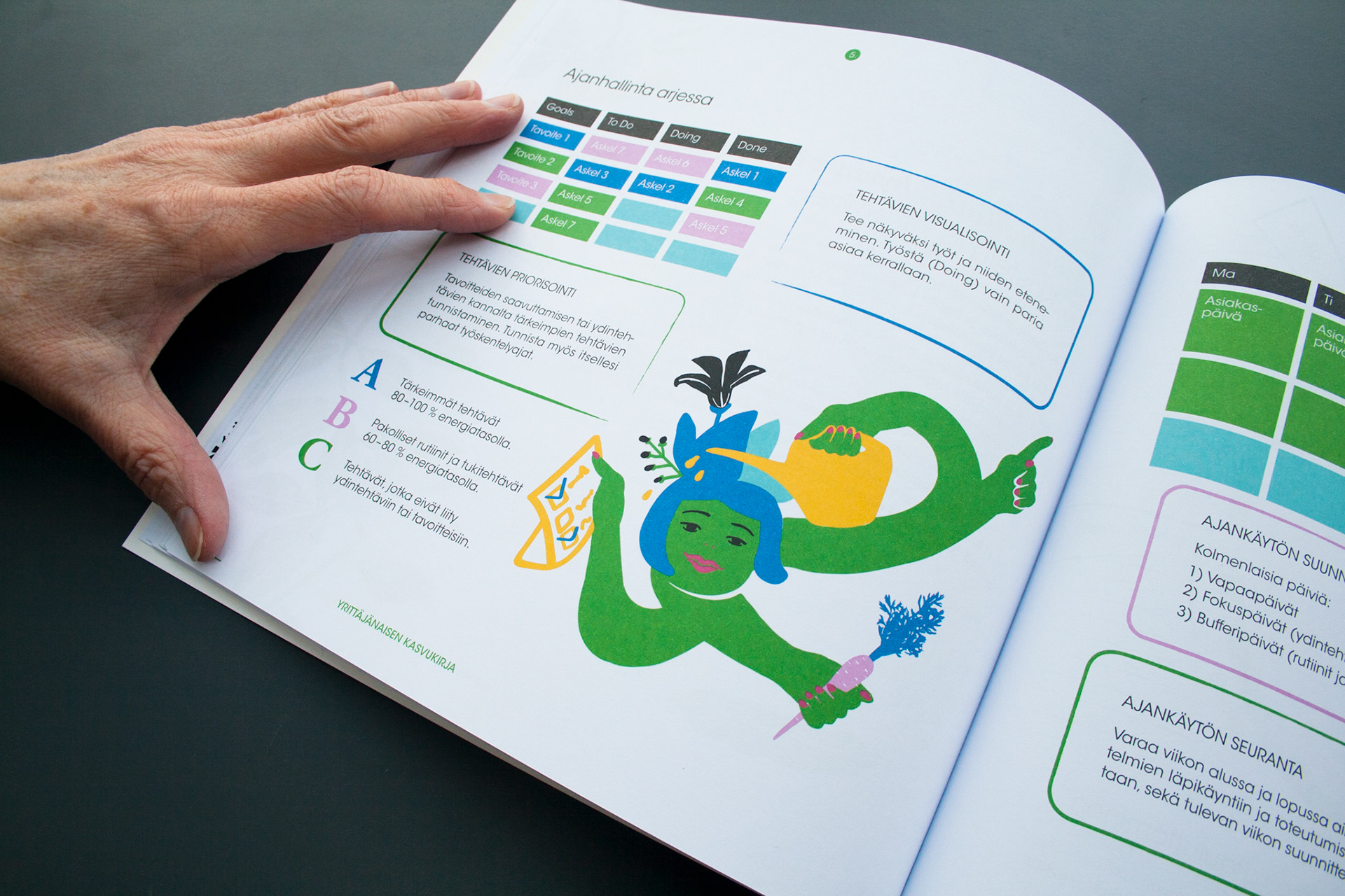 Toteutus: Uniikki visuaalinen ilme, taitto ja kuvitus, yrittäjänaisten opas- ja tehtäväkirjaan. Sisällöntuotanto: Metropolia Ammattikorkeakoulu ja Työterveyslaitos. Tilaaja: Oona – osaamista ja onnistumisen tukea yrittäjänaisille -ESR-hanke.
